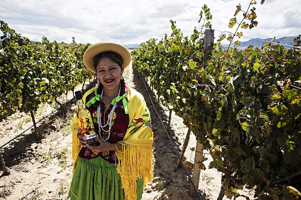 bolivian-woman-with-singani-63-bottle-in-field